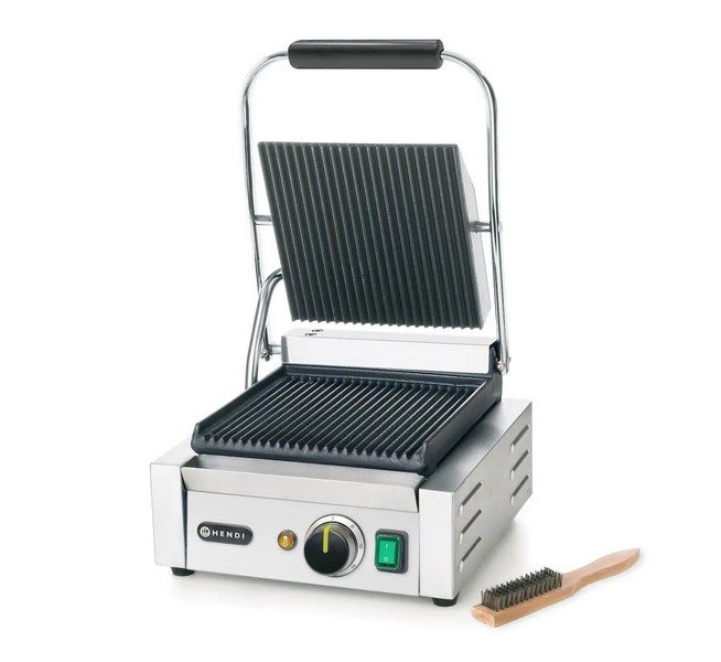 Kontaktní gril – rýhovaný – 1800 W | Hendi 263501 je profesionální kontaktní gril od společnosti Hendi, vybavený jedním grilovacím povrchem, na obou stranách rýhovaný. Nejvyšší kvalita, dokonalé zpracování a mimořádná funkčnost dělají z produktů Hendi vhodné do každé kuchyně. Sada obsahuje drátěný kartáč na čištění.